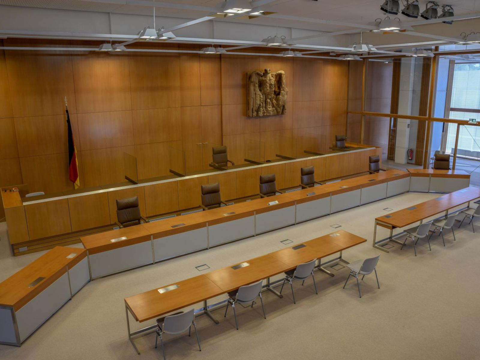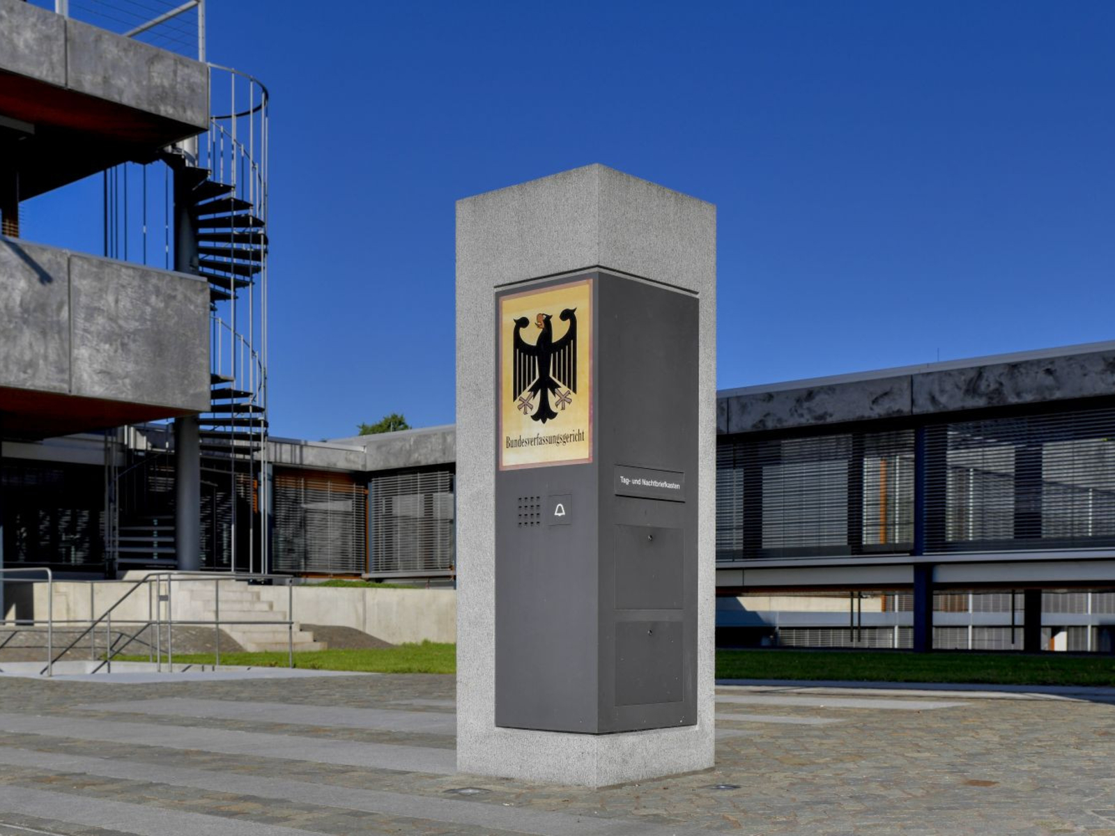 Since its foundation in 1951, the Federal Constitutional Court has been based in Karlsruhe. Until 1969, it was housed in the Prinz-Max-Palais, after which it moved to the building designed by Paul Baumgarten on Schlossplatz. Due to a lack of space, it was expanded by Berlin architect Michael Schrölkamp in 2007, retaining its open design to continue to symbolize democratic transparency. Particularly striking is the steel framework of the façade, which is reminiscent of a kind of shelf. The rational geometric shape of the building thus stands in stark contrast to its natural surroundings, the Botanical Garden. The court consists of two senates, each with eight members. Half are elected by the Bundestag, the other half by the Bundesrat, each with a two-thirds majority. The term of office is twelve years. Re-election is not possible.