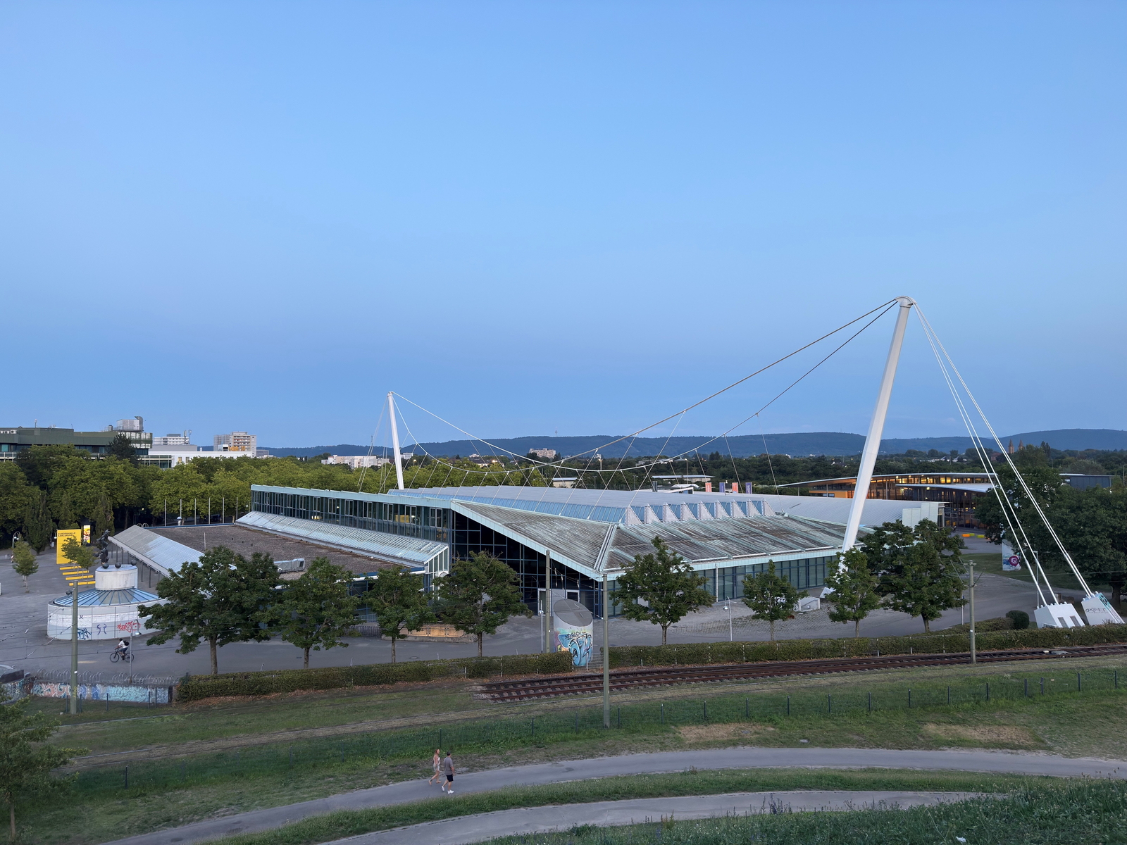 The roof construction of the Europahalle Karlsruhe is a special structural feature, as it is only supported by two steel cables.