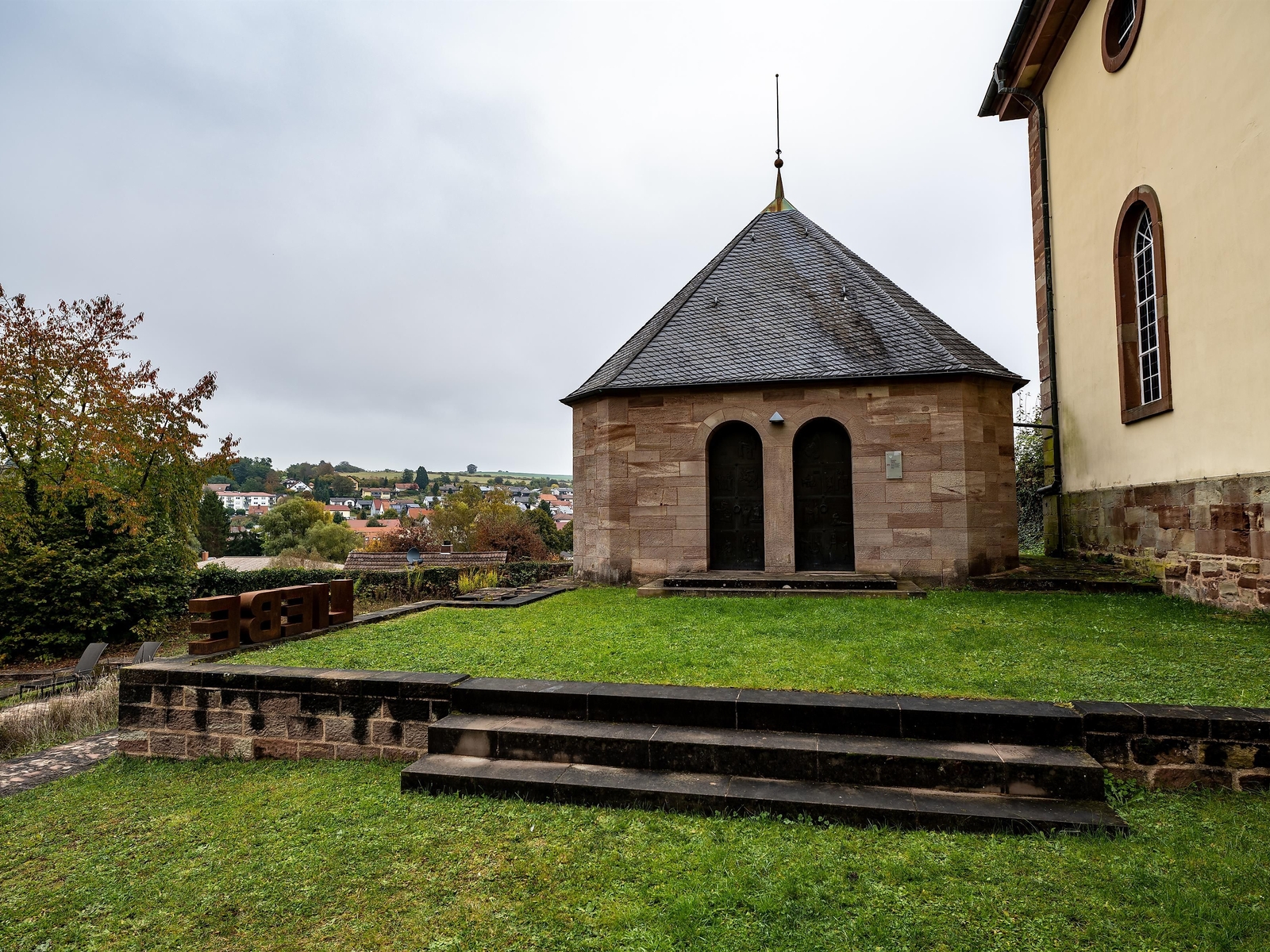 Back to Pirminius: The remains of the saint, who died in Hornbach in 753, were taken to Innsbruck in 1556, where they rest in a silver shrine within the altar niche of the Jesuit church. In Austria, he is still venerated as a folk saint today. In Hornbach, a chapel was built in 1957 as a memorial site for Pirminius. In it, his empty grave can be visited. Right next to it stands today’s Protestant monastery church.