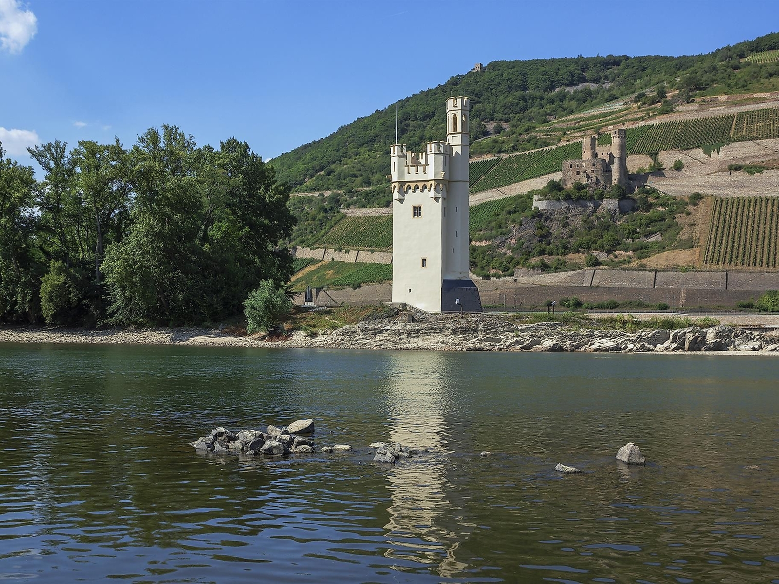 Historische Überlieferungen und Legenden ranken sich um den Turm auf der kleinen Rheininsel vor Bingen. Tatsache ist wohl, dass schon die Römer hier eine kleine Befestigungsanlage bauten. In der Herrschaftszeit der Franken verfiel diese aber mehr und mehr. Erst als Hatto II. 968 die Führung im Erzbistum Mainz übernimmt und Souverän über Bingen wird, gewinnt der Turm wieder an Bedeutung. Der Name „Mäuseturm", der 1516 erstmals belegt ist, leitet sich wohl von seiner Funktion als Wachturm (mittelhochdeutsch „musen" = lauern) ab. Doch der Turm wurde schon im 16. Jahrhundert mit der Legende von Bischof Hatto in Verbindung gebracht, der hier als Strafe für seine Unbarmherzigkeit bei lebendigem Leibe von Mäusen aufgefressen worden sei. Im Jahr 1298 wird der Turm in das Zoll- Sperrsystem der Burg Ehrenfels einbezogen.1689 zerstören französische Truppen das Bauwerk. 1855 errichten die Preußen auf der Insel einen Signalturm für die Schifffahrt, wie er heute noch zu sehen ist.