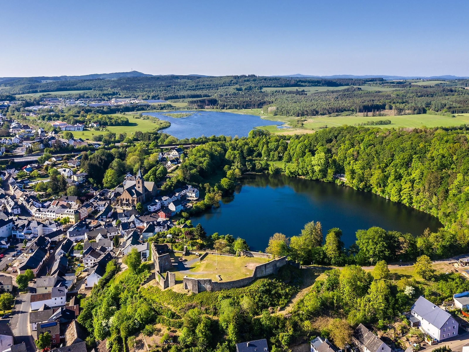 Today, the Ulmen Maar is 420 metres above sea level, has a surface area of 5.5 hectares and is 36 metres deep. The fact that volcanism is still active is shown by bubbles at the edge of the maar. They bear witness to its roiling past - but don't worry, there is no eruption in sight! An up to 20-metre thick wall of various rocks and ashes surrounds the funnel. For those interested, these witnesses of the explosive past are wonderfully open at St. Matthias Church. This unique wall with its differently coloured layers and round inclusions is not only worth seeing for geologists. The slopes of the Maar basin are overgrown with a beautiful forest, which can be discovered on a circular route. A detour up to the medieval castle ruins, from which crusaders once set out on their battles, is recommended. The view from the crater rim over the Maar and the Eifel behind it takes your breath away. Be it after a sweaty hike or a long car journey - the blue of the Ulmen Eifel Eye glows all too temptingly in summer. But bathing in the Maar is prohibited because it is classified as a nature and water protection area. Instead, you can enjoy the good air while fishing for pike and carp. Perhaps you will even catch a glimpse of the giant fish that is the subject of an old legend. The charming town of Ulmen of the same name lies directly on the Maar. Here guests can stop off at various cafés and restaurants and enjoy a good cup of coffee or a delicious meal. Parking: Visitors are best advised to park at the Old Post Office Square or the Market Square in Ulmen. Both places are centrally located in the town, so it is only a short walk from there to the shore of the Ulmener Maar.
