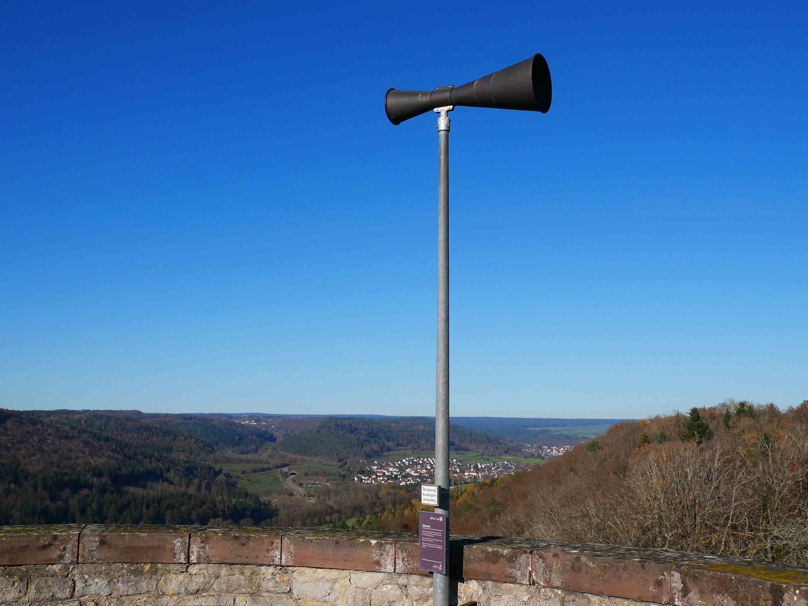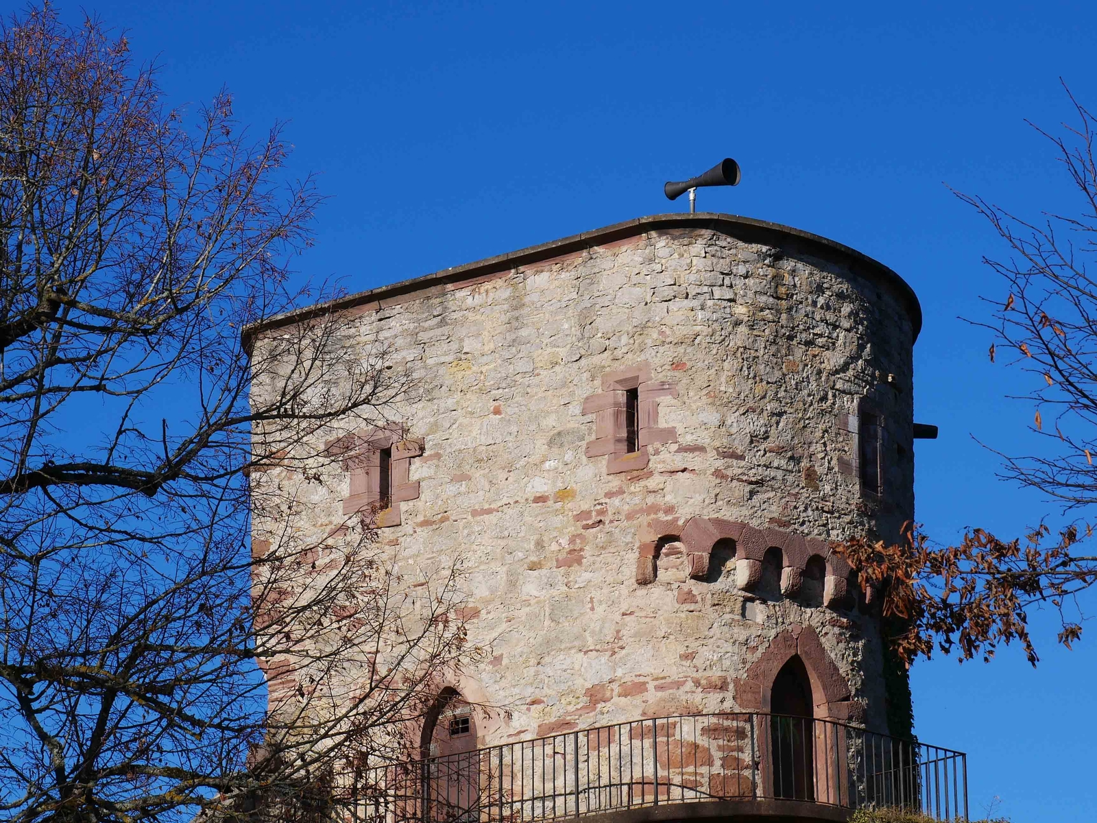 Bombs destroyed the harp in the spring of 1945. The northwestern tower, the stairway and the shield wall were heavily damaged. The new harp was mounted in 2005. It was a project of Nagold’s Historical Society and Friedrich Martin, who developed and made the harp. Sounds are produced, when strong air pressure passes through the narrow part of the funnel and causes the reeds to vibrate.