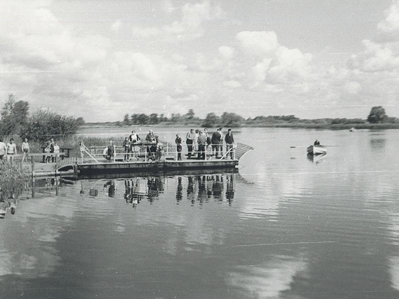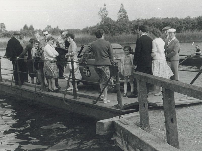 In 1928 the "Schweizerhaus" (today WENDENKRUG) opened on the island. A new chain ferry started operation. It transported people and vehicles to the island. Nearly 50 years later, in 1977, the old crank ferry had served its time. It was replaced by a modern motor cable ferry. This is still in operation today. Since 2020 it has been crossing the lake in "whisper mode". Instead of the old diesel engines, the ferry is now powered by an electric motor.