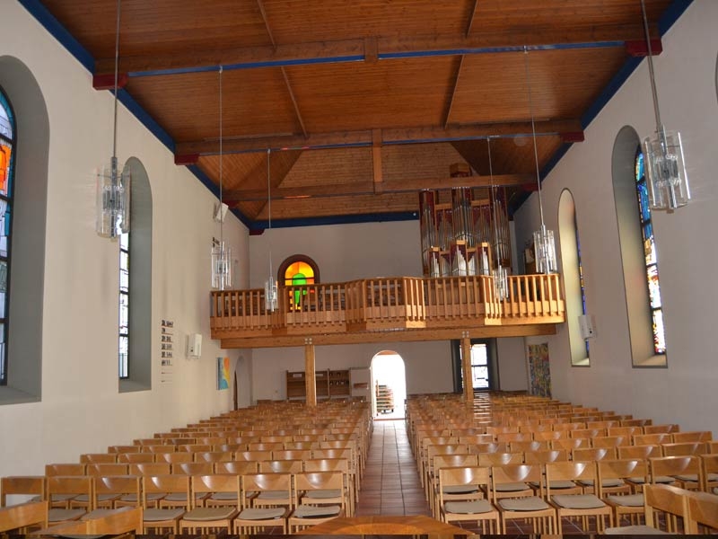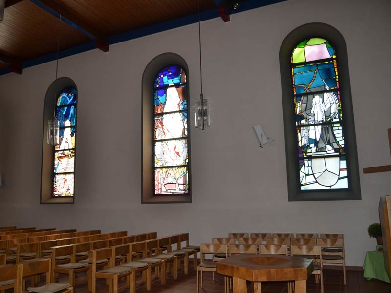 Die vom Kunstprofessor Georg Meistermann geschaffenen Glasfenster gelten als kunstgeschichtlich bedeutsame Kostbarkeiten und wären heute nach dem Urteil von Experten unbezahlbar. Je mehr Licht ins Kircheninnere fällt, desto lebendiger werden die Szenen. Die „Erscheinungsweisen Gottes in der Welt“ zeigen unter anderem die Erschaffung der Welt, Abraham, Moses vor dem brennenden Dornbusch, die Verkündigung an Maria zur Taufe der Gläubigen und die Begegnung des Auferstandenen mit Thomas. Die schillernden Farbnuancen des Bogenfensters links oben hinter der Empore in gelb, orange und rot repräsentieren das "Tor zum Leben".