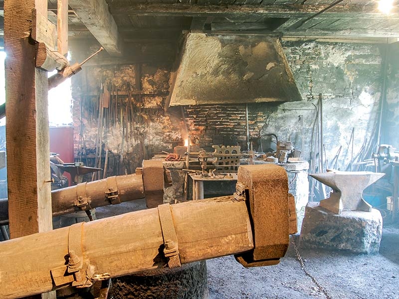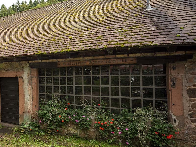 Die mit Wasserkraft betriebene Schmiede mit ihren mächtigen Hämmern und mechanischen Antrieben lieferte früher Waffen für die Ritter der Burg Hohengeroldseck.