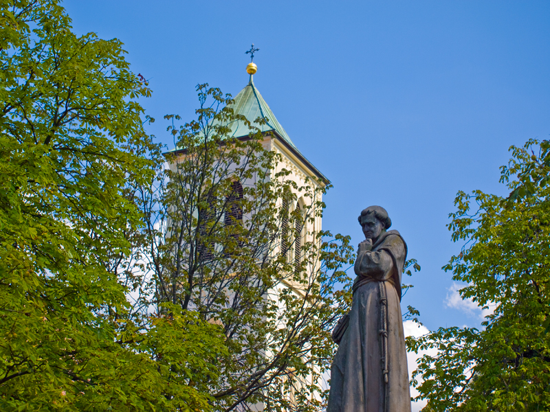 Durch den Abbruch der Konventsbauten im Westen und Süden wurde 1845 der heutige Rathausplatz geschaffen, auf den man 1848 das Denkmal für Carl von Rotteck (heute vor dem KG II) aufstellte, an dessen Stelle dann 1853 Alois Knittelsbrunnen-Denkmal für den Mönch Berthold Schwarz errichtet wurde, der lokaler Tradition zufolge um 1400 im Franziskanerkloster das Pulver erfunden haben soll.