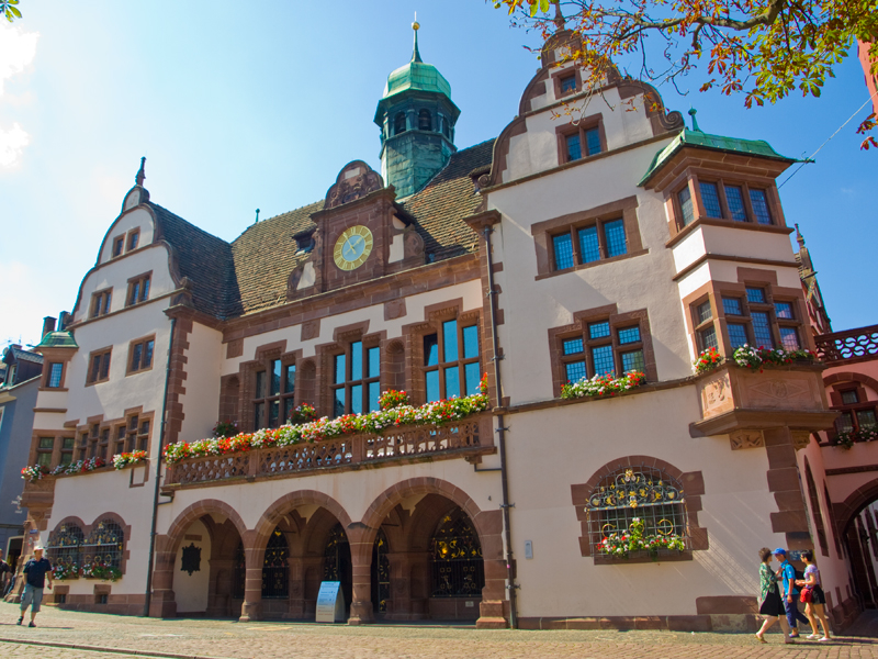 1578 verband die Universität das 1539 gebaute Doppelhaus "Zum Rechen" mit dem bereits 1559 erworbenen Nachbarhaus "Zum Phönix". Bis 1774 diente dieser Komplex als "Collegium Universititas". Nach der Aufhebung des Jesuitenordens war der Universität das Kollegiengebäude an der Bertoldstraße zugeteilt worden. Drei der vier Fakultäten und die Universitätsverwaltung zogen aus und überließen das jetzt "Alte Universität" genannte Gebäude den Medizinern. 1867 zog die Anatomie in ein Gebäude im Grüngürtel nördlich der Stadt, wo im letzten Drittel des 19. Jahrhunderts ein neues Viertel für die Universität entstand.