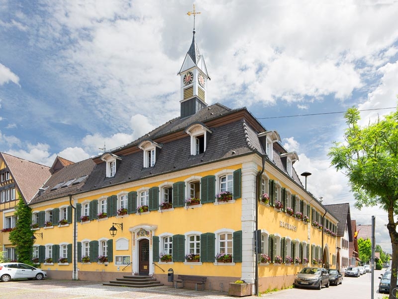 Das heutige Rathaus auf der Südseite war bis 1850 das Gasthaus „Zur Sonne", wie das Sonnensymbol mit der Jahreszahl 1767 über dem Eingangsportal zeigt. Das Anwesen wurde 1850 von der Gemeinde gekauft und zunächst als Armenhaus eingerichtet. 1880 erfolgten der Einbau eines Schulzimmers und einer Lehrerwohnung im Obergeschoss und eines Ratszimmers mit Archiv im Erdgeschoss. Zwischen 1885 und 1887 entstand das Türmchen mit Gemeindeglocke und Turmuhr. 1925 baute man das Feuerwehrgerätehaus mit dem 15 Meter hohen Schlauchturm an. Mit steigender Bevölkerungszahl wurden im Gebäude immer mehr Verwaltungsräume notwendig, sodass der letzte große Umbau und Erweiterungen von 1979 bis 1983 stattfanden.
