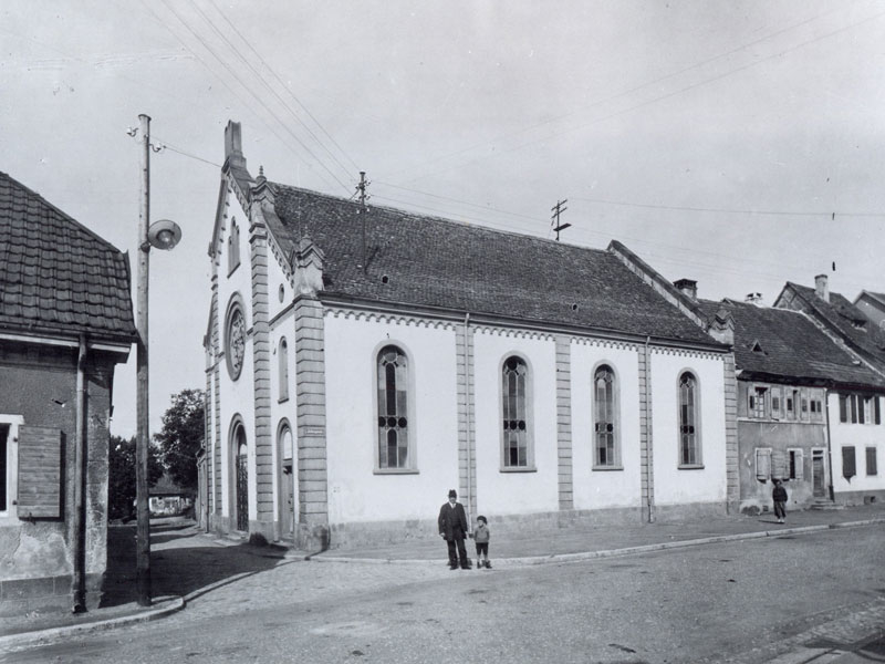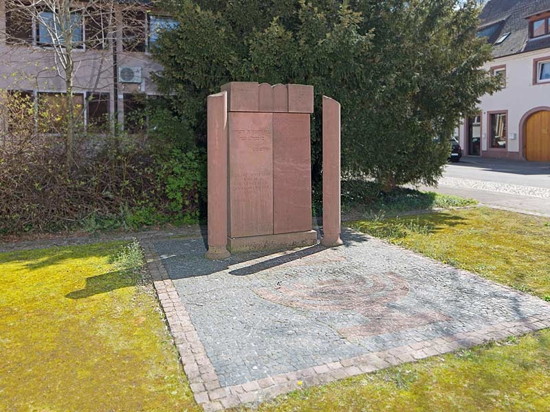 Former synagogue and mikwe. North-east of the square the synagogue, first mentioned in 1681, stood until its destruction during the French Revolution in 1793. New building here in 1804 on the land of the former “Zum Einhorn” (the Unicorn) Jewish hospital, converted 1863-70. Destroyed by arson attack on 10.11.1938. First memorial stone 1959. Today’s square design and memorial in 1998.