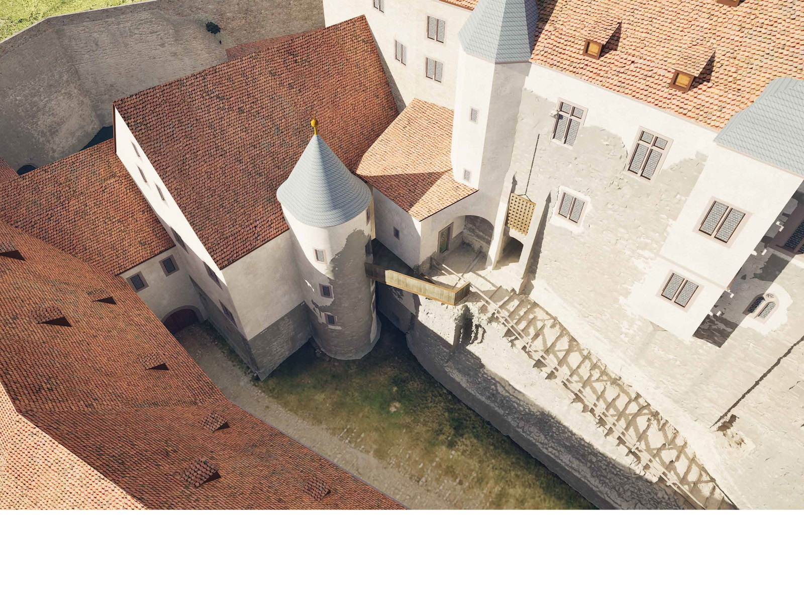 From the lower bailey, your path leads through the inner gate, which was the outer castle gate in the 14th century, when it was secured by a drawbridge. To the left, you can see the remains of the ‘Schneckenkasten’ or ‘snail box’. This was a storage building, known as a box, which also served as quarters for a castle commander in the 17th century. The tower on the side contains a spiral staircase, known as the snail, which was also once called the ‘Schneckenstiege’ or ‘snail climb’. What was once the castle well can be found behind the stairwell. It still contains about a metre of water at a depth of five metres.