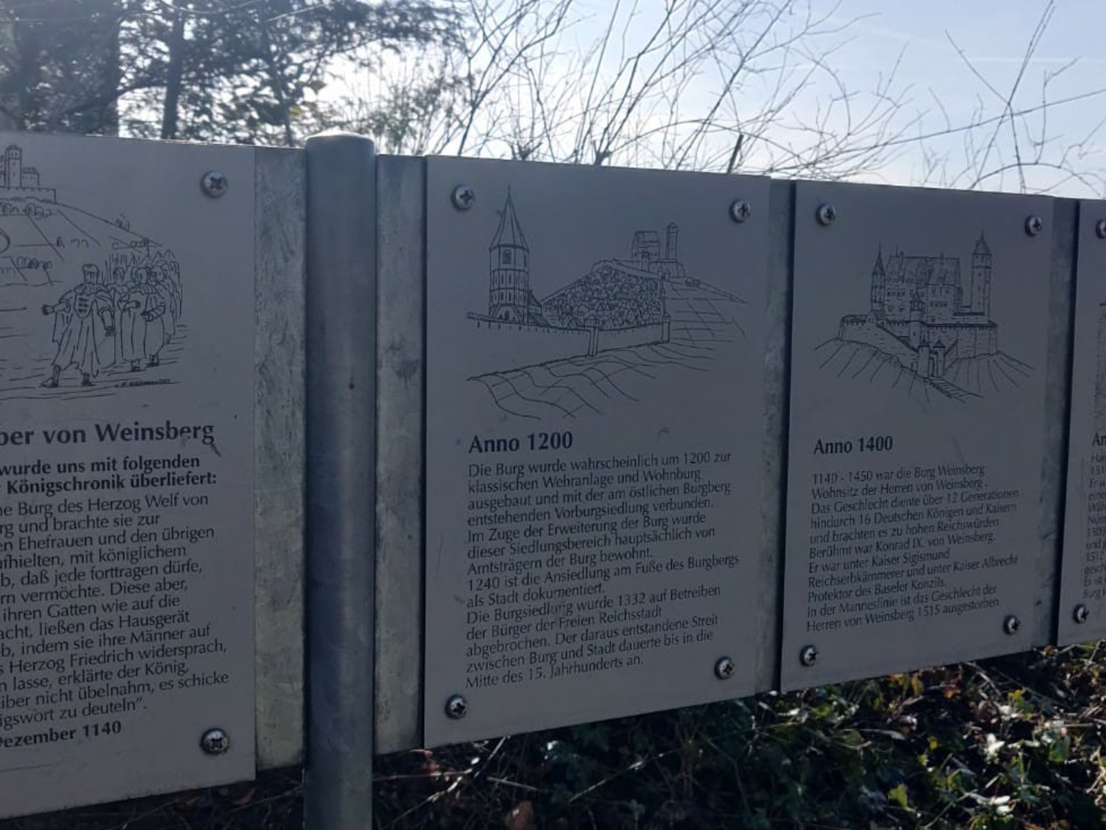 The Weibertreu castle ruins are an impressive viewpoint and small open-air museum at the entrance to the Weinsberg Valley. A particularly charming ascent can be made via the wine and rose circular trail. Catering is available at the castle during the summer months. The castle ruins are particularly interesting for visitors due to their exposed location. From the castle hill—which is now used for viticulture—the view stretches far across the Weinsberg Valley into the Löwenstein Mountains. A small special feature: the royal wall with the names of royalty who have visited the castle and the "Stone Album." The "Stone Album" contains numerous inscriptions that bear witness to a history steeped in tradition. The castle grounds are open to visitors all year round and are only closed in icy or snowy conditions. A small admission fee is charged. ### Castle tour & exhibition "The Lords of Weinsberg" A tour with various information boards on the history and architecture of the castle has been set up in the castle grounds. ### Castle and guided tours - Regular public tours on the last Sunday of every month from May to October - Appointments for groups can be made at any time. ### Catering at the castle The castle kiosk has been renovated and reopened as the "s'Rickele" café. The café offers a delicious selection of food and drinks. It is usually open on weekends and public holidays when the weather is good. There are several small picnic areas with tables and benches in the castle grounds. ### The story of the "loyal women" In November 1140, the Staufer King Conrad III advanced on Weinsberg Castle, besieged it for several weeks, and was ultimately victorious. The Cologne Royal Chronicle reports that the king promised the women at Weinsberg Castle free passage and gave them permission "to carry away whatever they could carry on their shoulders." The women took the king at his word and carried their husbands on their backs down into the valley, thus saving them from execution. The women became known as the "Faithful Women" of Weinsberg and gave the castle its name. Numerous exhibits and stories about the legend of the Faithful Women and the history of the castle can be discovered in the Weibertreu Museum. The small museum is located in the town hall of Weinsberg. ### The history of the castle The complex is the ruin of a castle that was probably built for military purposes in the early 11th century. It was first recorded in 1037. The founder, Countess Adelheid, is said to have lived at Weinsberg Castle until the foundation. Countess Adelheid was the mother of Emperor Conrad II in her first marriage and is therefore referred to as the progenitor of the Salian dynasty. In 1140, the castle was still owned by the Guelphs, who fought with the Staufers for power in the empire. ### Wine and rose trail on the castle hill The approximately 4 km long **[Wine and Rose Trail](https://www.heilbronnerland.de/tour/wt7-wein-und-rosenrundweg-weinsberg)** leads through the vineyards of the Weinsberg State Winery. The route is lined with countless varieties of roses and wild roses. In the western part, there is also a small wine trail set up by the state winery and the State Teaching and Research Institute for Viticulture and Pomology in Weinsberg. Information boards explain the viticulture.