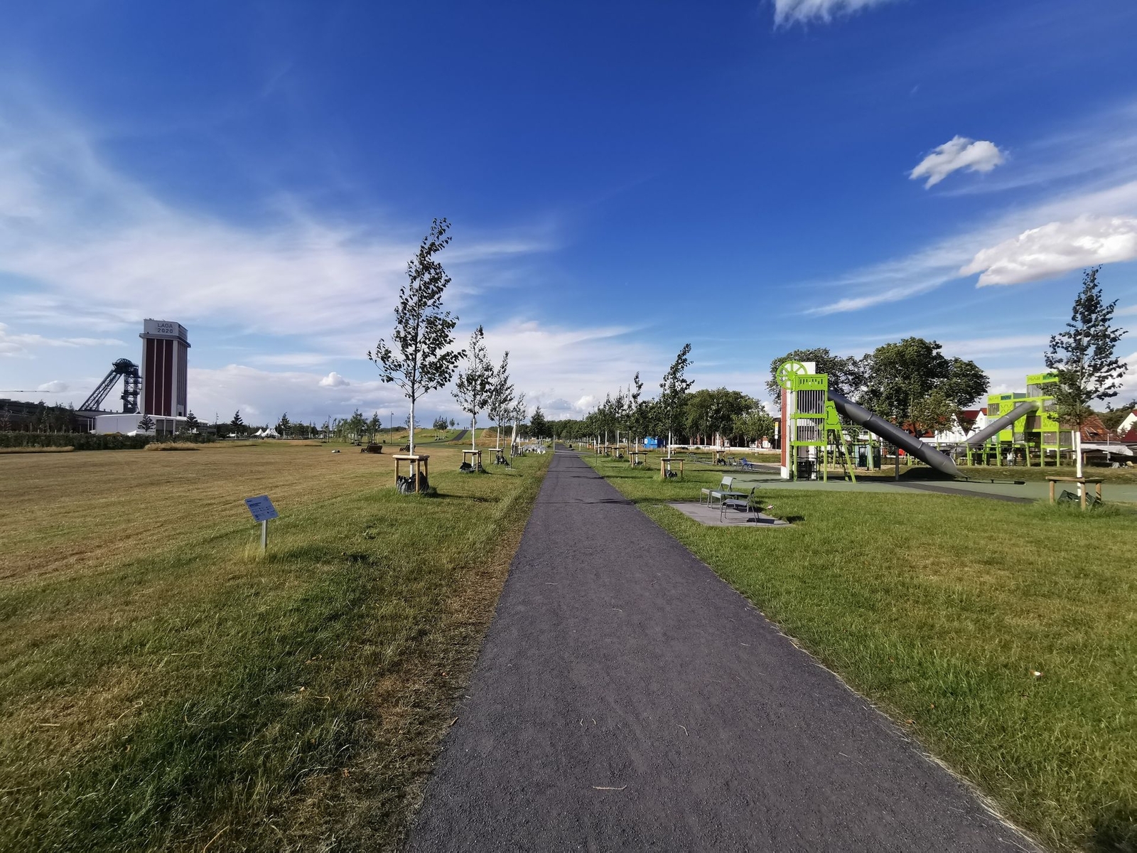 Rechts Spielplatz Bergbau in Miniatur, links Förderturm und Fördergerüst © Stefan Büschken, Stadt Kamp-Lintfort