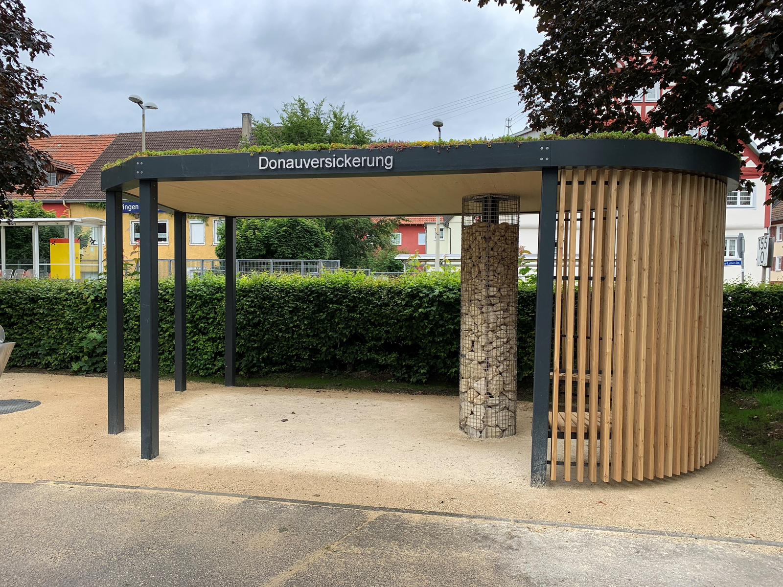 Official Donaubergland information point on the Danube infiltration along the Danube Cycle Path, in the form of a covered pavilion. There are three Donaubergland information points along the Danube infiltration on the Danube Cycle Path between Immendingen and Fridingen in the Danube Valley. The information point in the Möhringen district of Tuttlingen is located in the center of town, right next to the train station near the town hall ("Im Anger"). It provides information boards with key information and tips on the "Fascination of the Danube Seepage" project and on this geologically unique phenomenon of the Danube seepage.