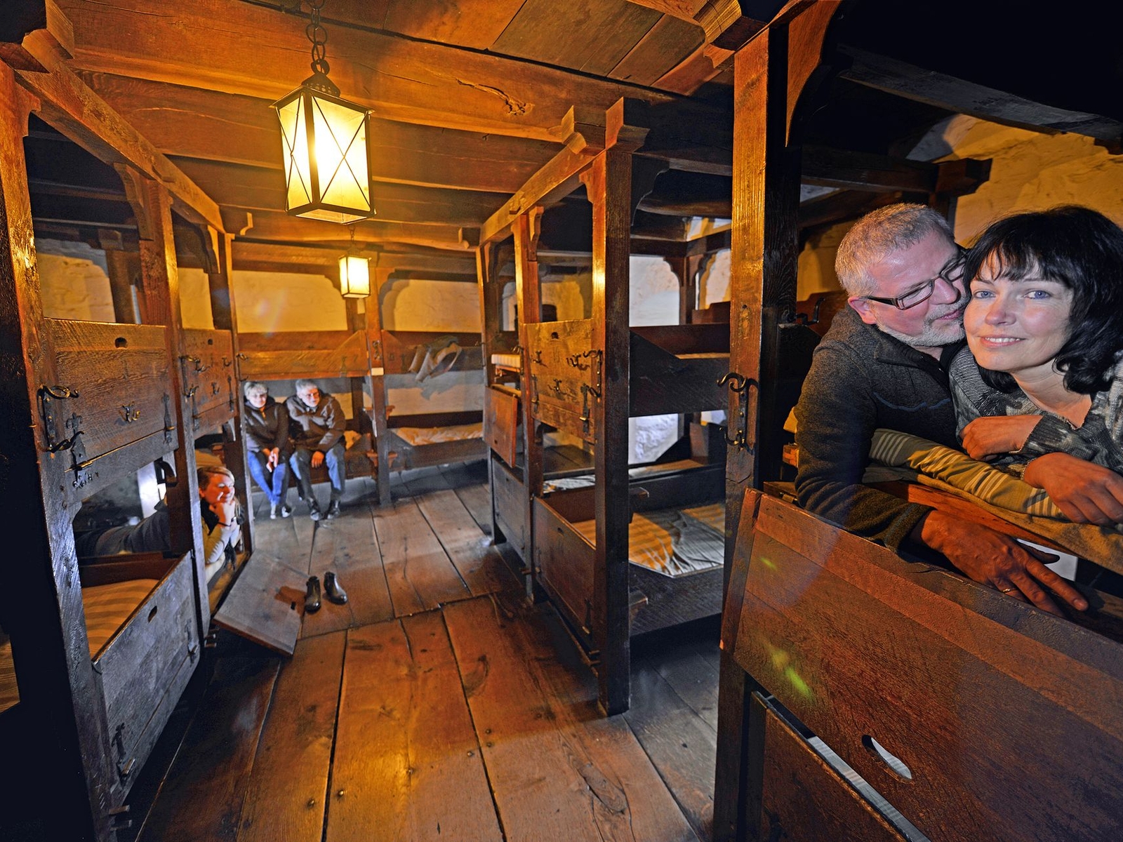 In den Jahren 1906 bis 1915 wurde die Burg umfassend renoviert und zu der imposanten Burg umgestaltet, die heute alle Besucher in ihren Bann zieht. Museum Weltjugendherberge Ihre internationale Bekanntheit verdankt die Burg Altena der ersten ständigen Jugendherberge der Welt, die hier 1914 eingeweiht wurde. Sie ist als Museum Weltjugendherberge noch im Originalzustand erhalten. Hier können Besucher in Original-Betten ausprobieren, wie sich Wanderer vor mehr als 100 Jahren betteten. Museum der Grafschaft Mark Hauptmuseum auf der Burg ist das Museum der Grafschaft Mark. Die Ausstellung (Link zu 360° Aufnahmen) zeigt die Entwicklung der Region von der geologischen Frühgeschichte über das Mittelalter, die frühe Neuzeit und das Industriezeitalter bis in die Gegenwart. Üppige Inszenierungen lassen die Besucher teilhaben an den Kämpfen, Jagden und Tafelfreuden der Ritter und Adeligen. Sie erfahren viel über das Leben der Bauern und Handwerker. Erlebnisaufzug Burg Altena Seit dem Frühjahr 2014 kann man mit dem neuen Erlebnisaufzug barrierefrei von der Talsohle der Stadt Altena bis in den oberen Burghof gelangen. Der Erlebnisaufzug Burg Altena ist „Das neue Tor zur Burg”: 90 Meter geht es in den Berg hinein, 80 Meter nach oben. Unterwegs sind an sieben Stationen Sagen und Geschichten der Region hautnah erlebbar. Wenn sich die Aufzugstür im Burghof wieder öffnet, wird die Reise auf der Burg fortgesetzt. Gruppenführungen und Museumspädagogik Ein besonderes Angebot auf der Burg sind Gruppenführungen und museumspädagogische Programme. Das Angebot reicht von Kindergeburtstagen bis zu Themenführungen. Bei Kindern besonders beliebt sind die Ritterprüfung „Vom Knappen zum Ritter“, die „Schatzsuche“ und das Programm mit der Hexe Söckchen und der Fledermaus Fläd. Wer möchte, kann das Museum auf eigene Faust erkunden. Besucher können sich auch mit Hilfe eines digitalen Museumsführers durch die Burg Altena leiten lassen. Den Multi-Mediaguide gibt es in den Sprachen Deutsch, Englisch und Niederländisch. Veranstaltungen Während des gesamten Jahres gibt es auf der Burg Altena ein umfangreiches Veranstaltungsprogramm. Neben größeren Festen wie Anno Tuck am ersten Augustwochenende lohnt es sich ebenfalls zu kleineren Aktionen wie der Greifvogelschau  und Vorführungen im Rahmen des Zeitsprungs zu kommen. Aktuelle Infos unter: www.burg-altena.de In der dunklen Jahreszeit erstrahlt die Burg in einem wunderbaren Glanzlicht, wenn die Außenmauern zur Lenneseite, Türme und Innenhöfe künstlerisch leuchtend in Szene gesetzt werden. Die Adventszeit startet mit dem Winter-Spektakulum: Die Burg im Fackelschein, weihnachtliche Wohlgerüche und ausgelassene Stimmung sorgen dann für stimmungsvolle Atmosphäre. Burgrestaurant Das Restaurant der Burg Altena bietet ein reichhaltiges Angebot. Für Gruppen ab 25 Personen sind Ritteressen möglich. Weitere Infos unter: Burgrestaurant Altena, Telefon: 02352 / 548 86 95 Historische Parkanlage (Weyhe-Park) 1843 beauftragt der Preußenkönig Friedrich Wilhelm IV. seinen Gartendirektor Maximilian Friedrich Weyhe mit der Planung einer öffentlichen Parkanlage für den Altenaer Burgberg. Der Berg wird mit Promenadenwegen, mit Aussichtspunkten und begleitenden Pflanzungen von Alleebäumen und Baumgruppen verschönert. Weyhe orientiert sich dabei am Stil des englischen Landschaftsgartens. Auf der Lenneseite bieten die schroffen Felspartien in Kombination mit Baumgruppen und der Wegeführung überraschende Ausblicke in die Landschaft. Allerdings verwilderte der Park wegen nicht ausreichender Pflege. Seit einigen Jahren finden umfangreiche Maßnahmen statt, um den Park für die Besucher wieder attraktiv zu machen. So wurden Infotafeln aufgestellt und Wege und Treppen saniert. Unterhalb der Veranda des Restaurants entsteht ein neuer Spielplatz. Aufenthaltsdauer Für einen Besuch der Museen Burg Altena sollten Sie sich etwa eineinhalb bis zwei Stunden Zeit nehmen. Die Besichtigung der Museen Burg Altena und des Deutschen Drahtmuseums dauert etwa drei bis vier Stunden - einschließlich eines dazwischen liegenden Aufenthaltes in der Burggastronomie. Besonders günstig ist der Besuch mit der Kombikarte, die die Fahrt mit dem Erlebnisaufzug und den Besuch der Museen Burg Altena und des Deutschen Drahtmuseums beinhaltet. Die Museen Burg Altena sind Ankerpunkt auf der Tälerroute der Europäischen Route der Industriekultur und ein Highlight von WasserEisenLand - Industriekultur in Südwestfalen. Wenn Sie uns besucht haben, schreiben Sie uns gerne über Ihr Erlebnis eine Bewertung.