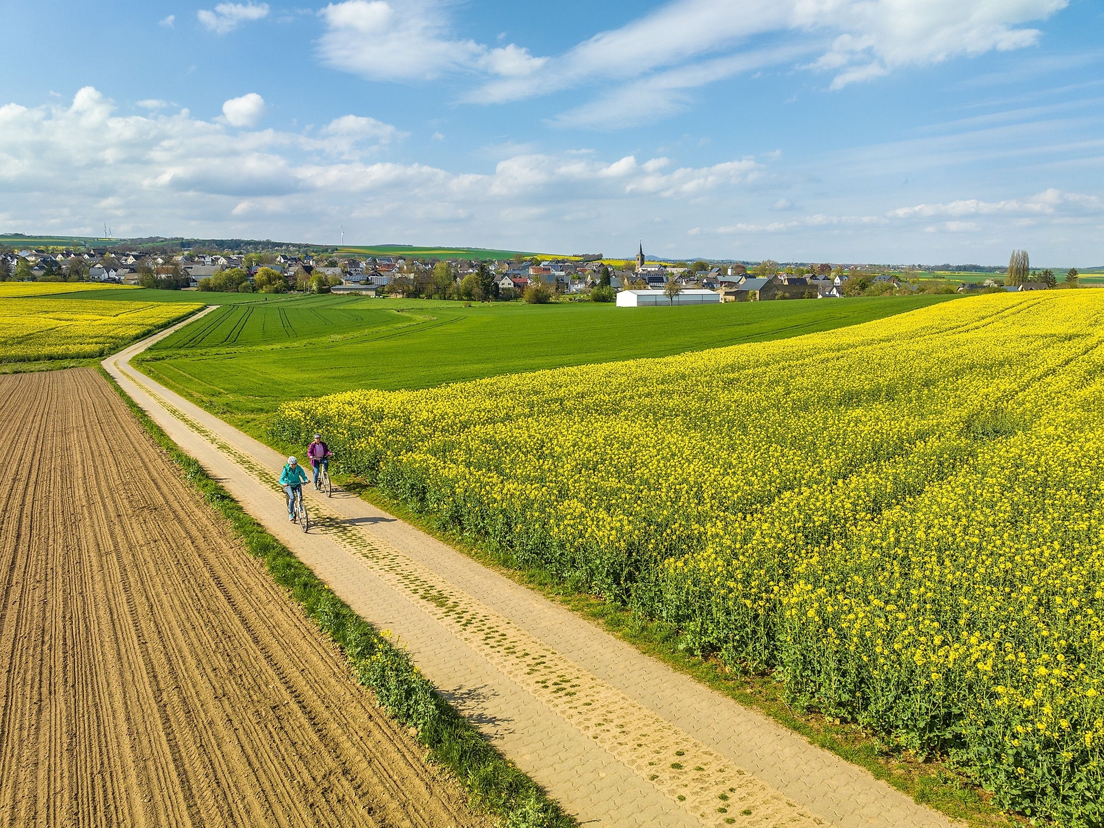 Mayen-Polch, Polch-Ochtendung, Polch-Münstermaifeld - drei Abschnitte 10 -18 km lang. Kombinationsmöglichkeiten im leuchtend gelben Maifeld auf ehemaliger Bahntrasse.