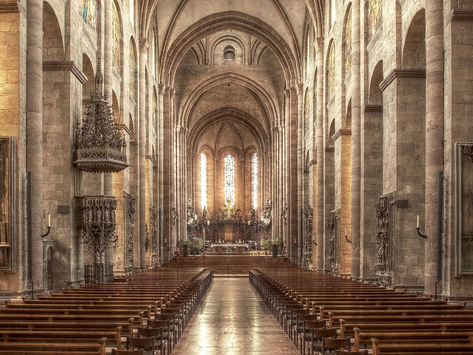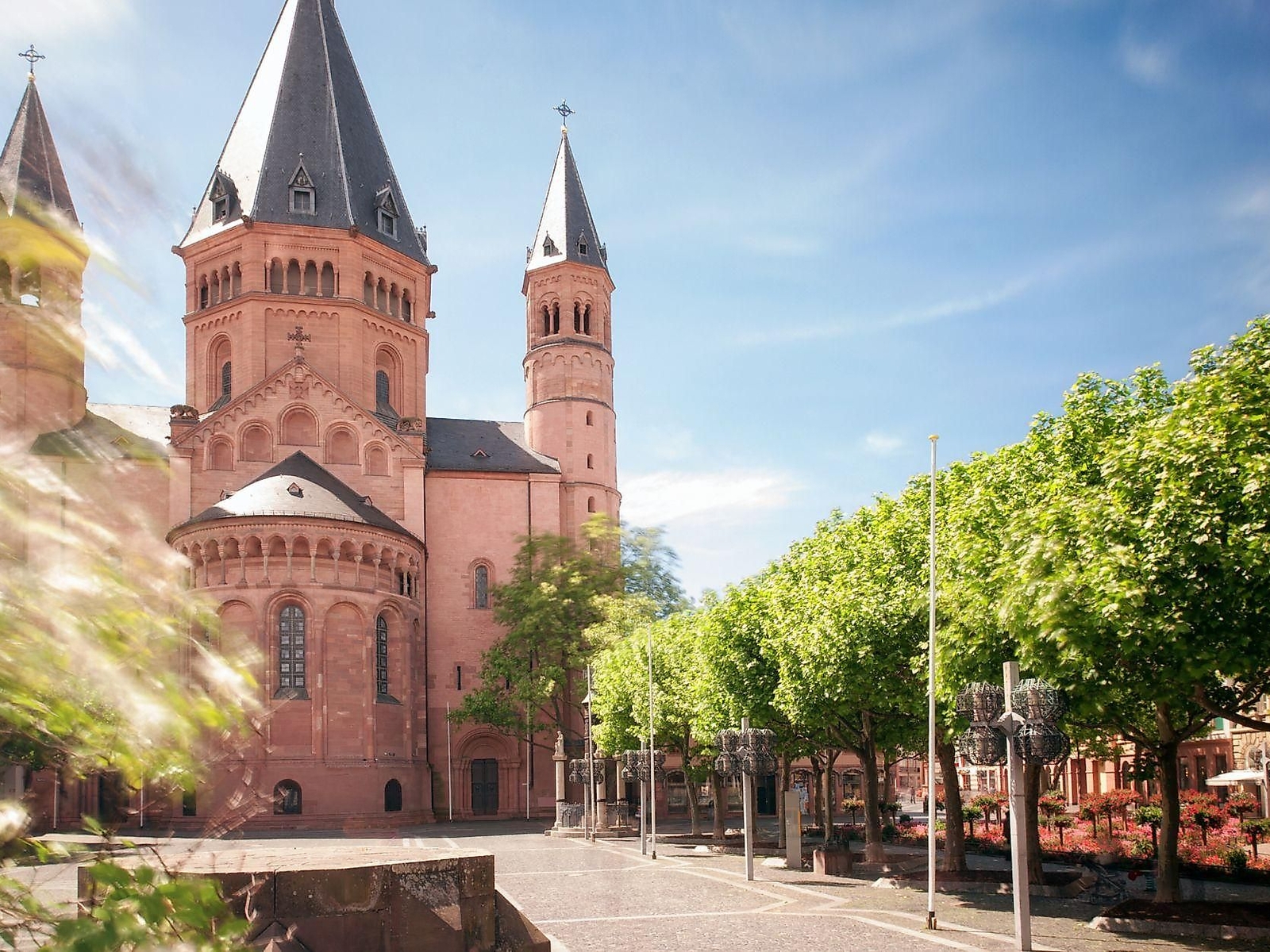 Willigis, Erzbischof und zugleich Erzkanzler des Deutschen Reiches, legte 975 den Grundstein für den Dom, geschaffen nach dem Vorbild von St. Peter in Rom. Sieben Königskrönungen fanden im Lauf der Jahrhunderte im Mainzer Dom statt. Allerdings überstand der Neubau den Tag der Weihe im August 1009 nicht - ein Brand zerstörte das Bauwerk, und der Dom konnte erst 1036 erneut genutzt werden. Willigis wurde deshalb in St. Stephan beigesetzt. Aus seiner Zeit stammt das älteste erhaltene Ausstattungsstück der romanischen Pfeilerbasilika: die bronzenen Türflügel des Marktportals. Die Inschrift dieses zeremonialen Tors weist auf den Erbauer und den Künstler hin. Drei Schiffe hat der Dom, zwei Chöre und zahlreiche Kapellenanbauten. Der Westchor mit dem Hauptaltar ist St. Martin, der Ostchor St. Stephan geweiht.