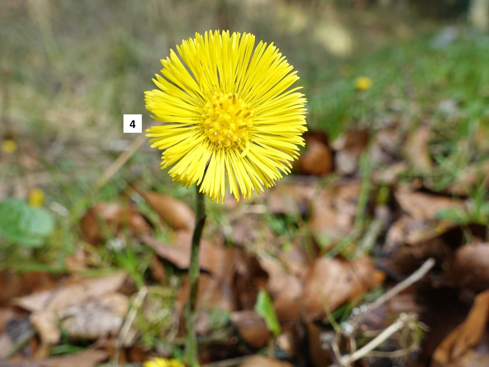 Es ist der bereits im Vorfrühling blühende Huflattich 4 (Tussilago farfara). Seine Blätter kommen erst, nachdem seine Blüte schon wieder verschwunden ist. Der lateinische Name dieser Heilpflanze weist auf ihre wohltuenden Wirkungen bei Husten hin.